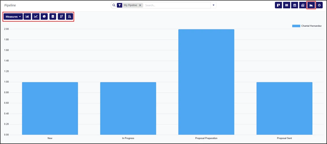 This layout shows opportunities in a graphic format that can be further tailored to display results for expected revenue, prorated revenue, count, and more. Other options include viewing the information in line chart, pie chart, stacked chart, and descending/ascending bar chart formats.
