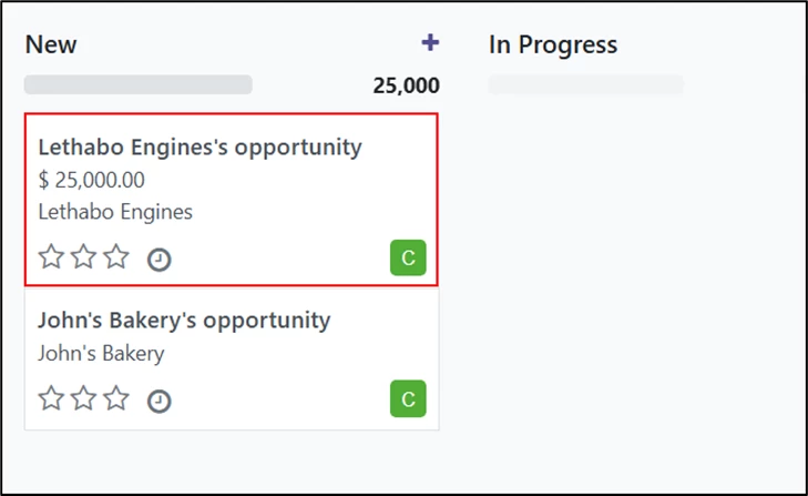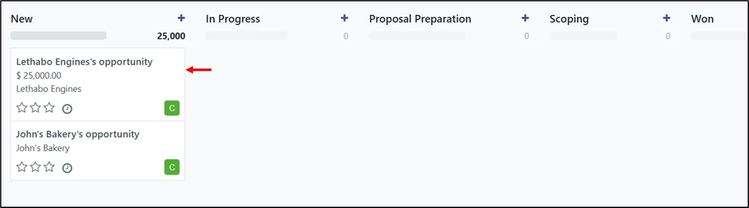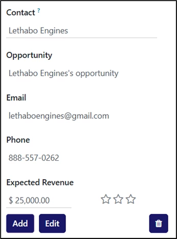 Enter the company or contact details and expected revenue if needed. Use the stars to indicate priority: one star for Medium, two for High, and three for Very High. Click “Add,” or press Enter on your keyboard.