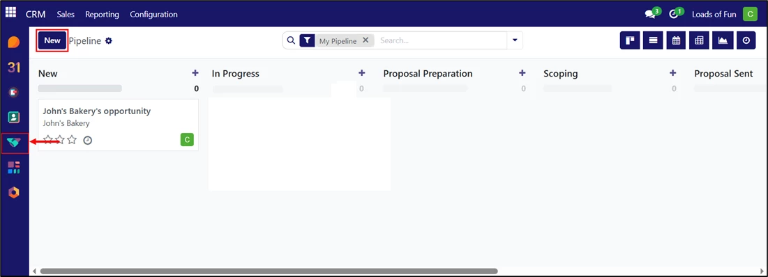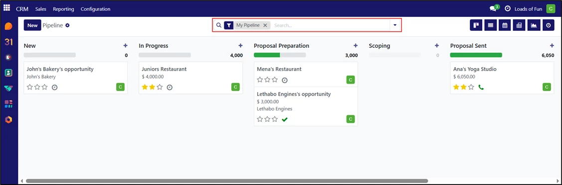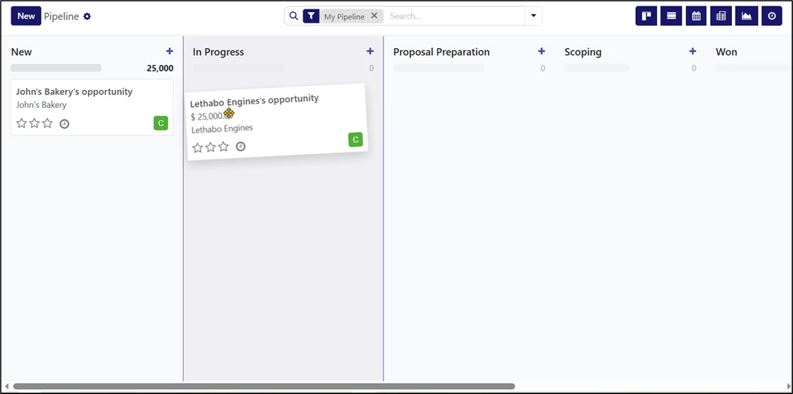 Once an opportunity is assigned, it can be moved through the pipeline for the selected salesperson. The pipeline can be filtered by status.
