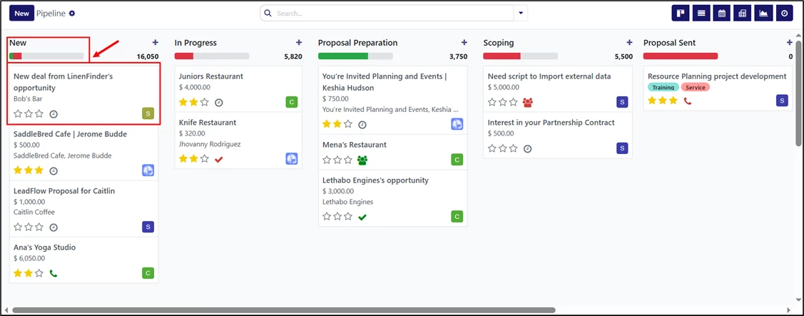 If leads have been automatically imported from LinenFinder, they will appear in the left-most column of the pipeline. In this example, that is the “New” column.
