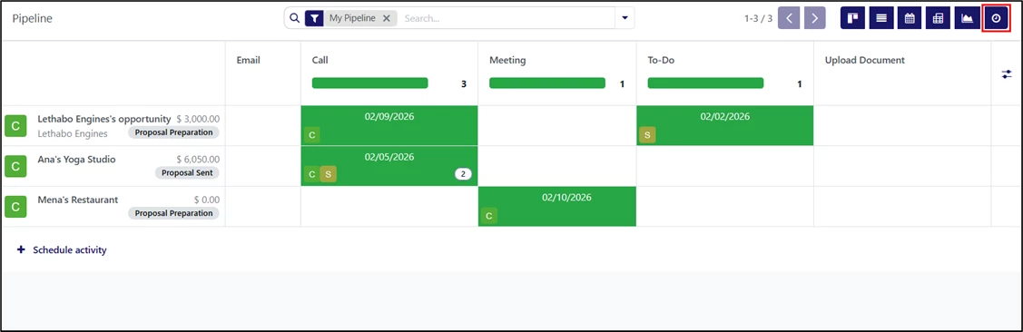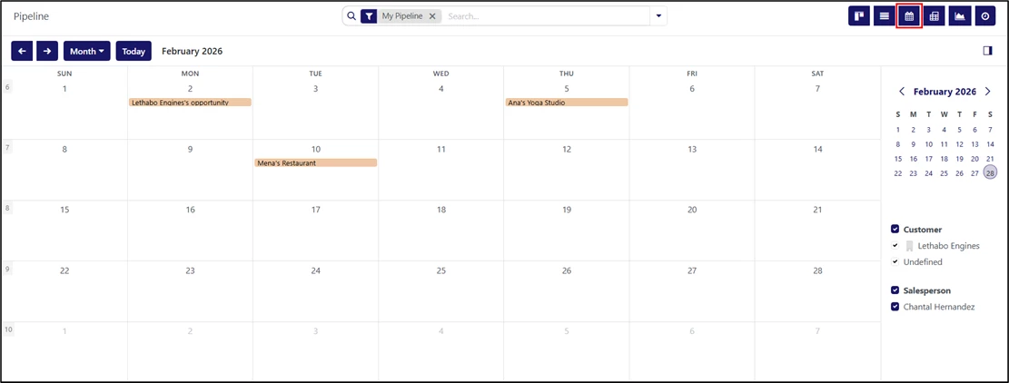 When viewing opportunities in the Pipeline, you can use the Calendar View to quickly review upcoming activities/actions for specific opportunities.