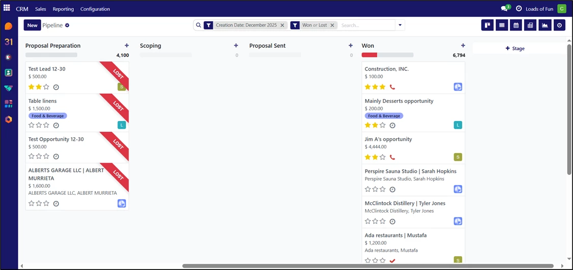 Pipeline Screen Filtered by Won & Lost Opportunities Created in December 2025: