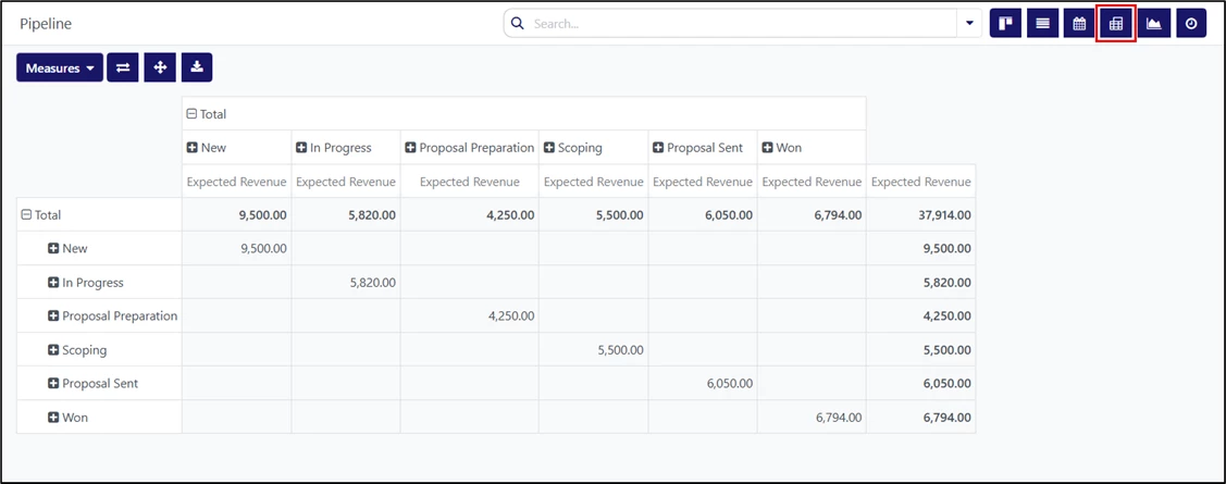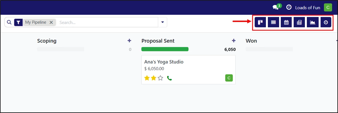 The default layout is Kanban-style, with columns for each stage of the sales process. The top-right portion of the screen contains additional layout options that work with the main filter dropdown.