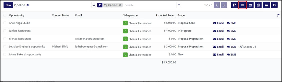 The List View provides a concise layout showing the opportunities in the pipeline. You may adjust the filters as needed to view different types of opportunities.