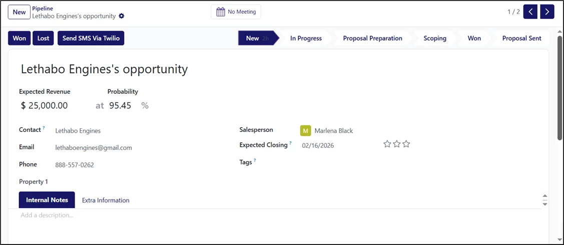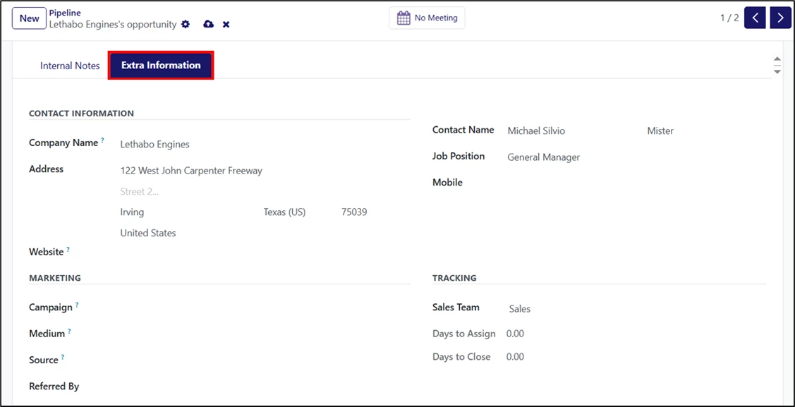 The Extra Information tab contains fields to update additional company details, enter marketing information, assign a sales team, and specify a timeframe for assigning and closing the opportunity.